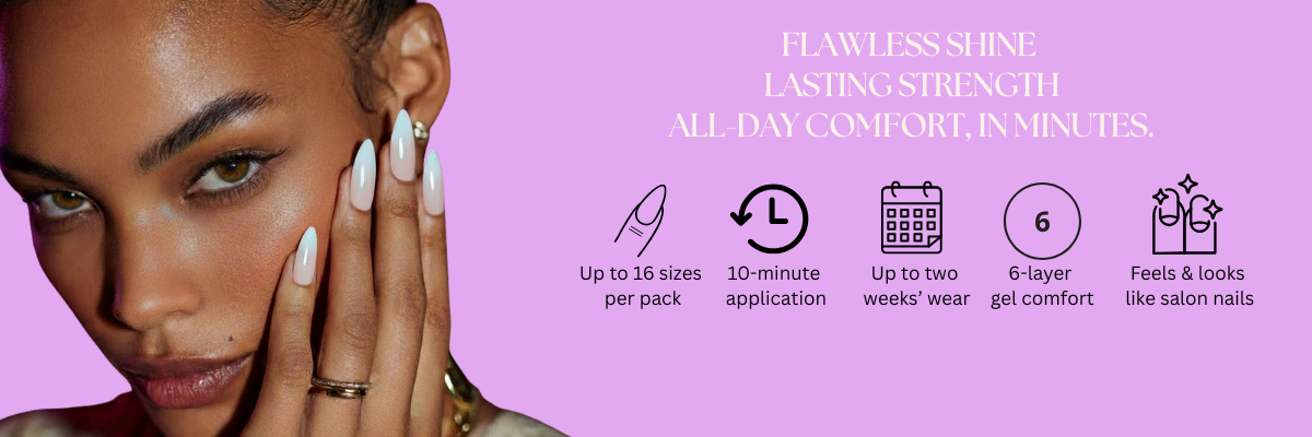 Press-on nails are pre-designed artificial nails you can easily apply at home using adhesive tabs or glue. They come in a variety of shapes, lengths, and styles — from French tips to bold colours — and offer a fast, affordable alternative to salon acrylics or gels. They can last up to two weeks with proper application and care.